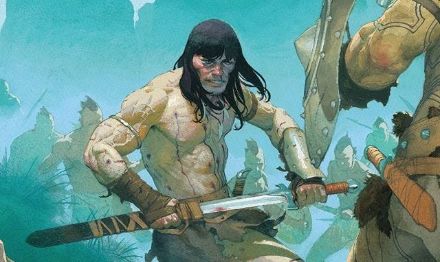 Quería algo diferente a los tebeos europeos autobiográficos o los de superhéroes estadounidenses que había estado leyendo, y en esa tesitura me encontré las grapas de Conan el bárbaro (Jason Aaron, Mahmud Asrar, Matthew Wilson) entre las novedades de la tienda.